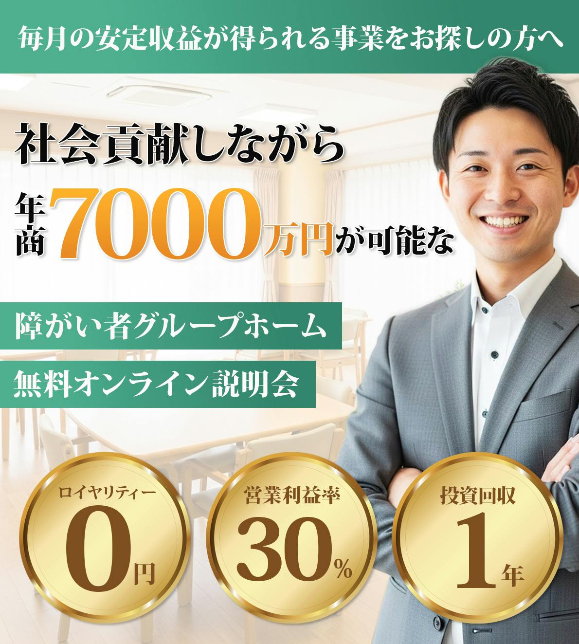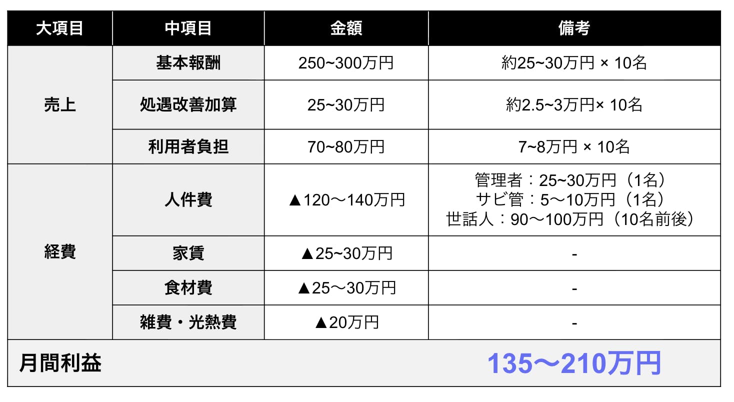 障がい者グループホームの売上は、 1人当たり30〜40万円になるので、 10名の利用者を集めるだけで、